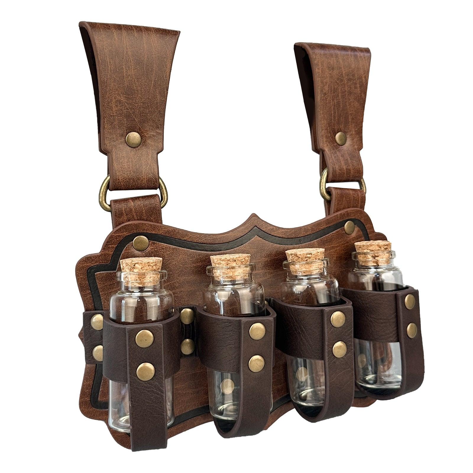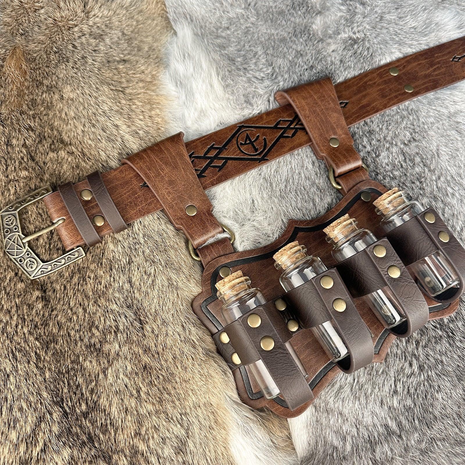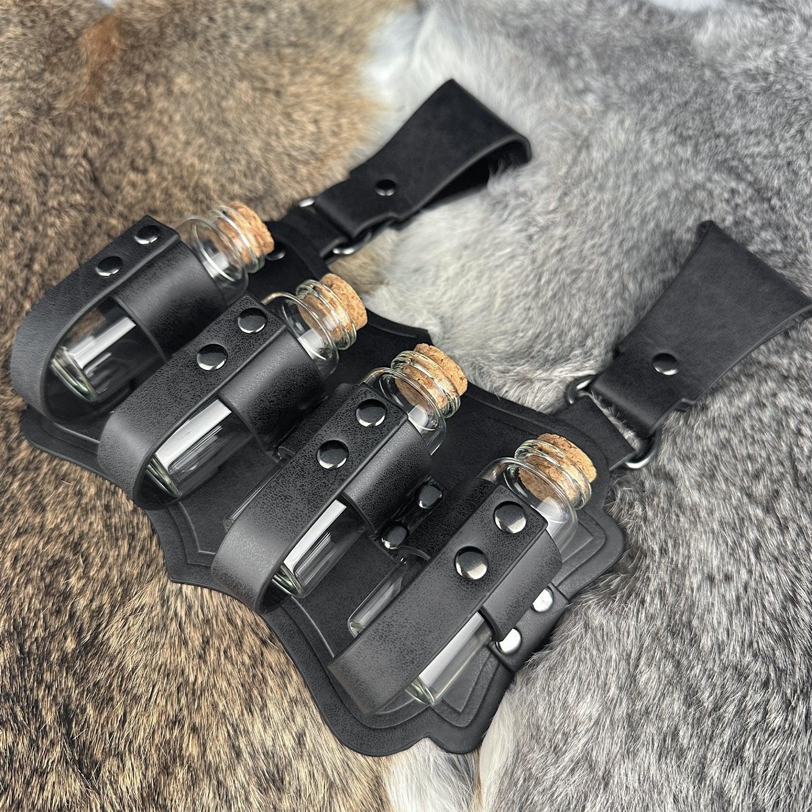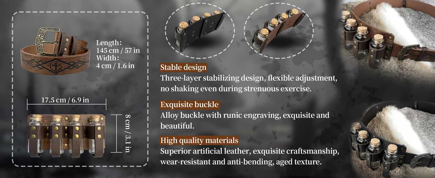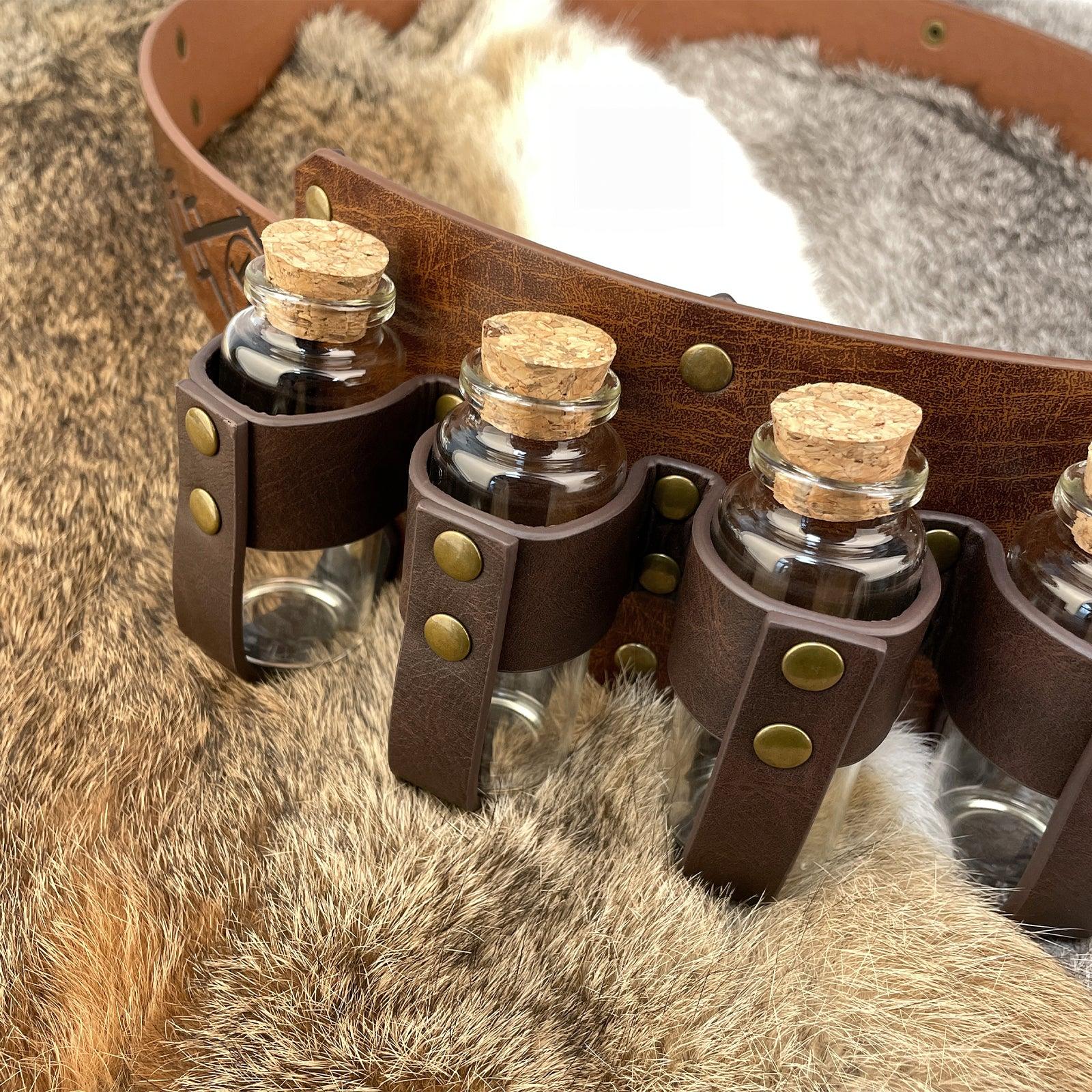 - COOL DESIGN- Featuring fantasy embossing for a distinctive and magical look, this belt comes equipped with four glass potion bottles, ideal for storing small amounts of liquids or small accessories. Each bottle is securely fastened yet easily accessible. The belt is sure to stand out on any adventure.
