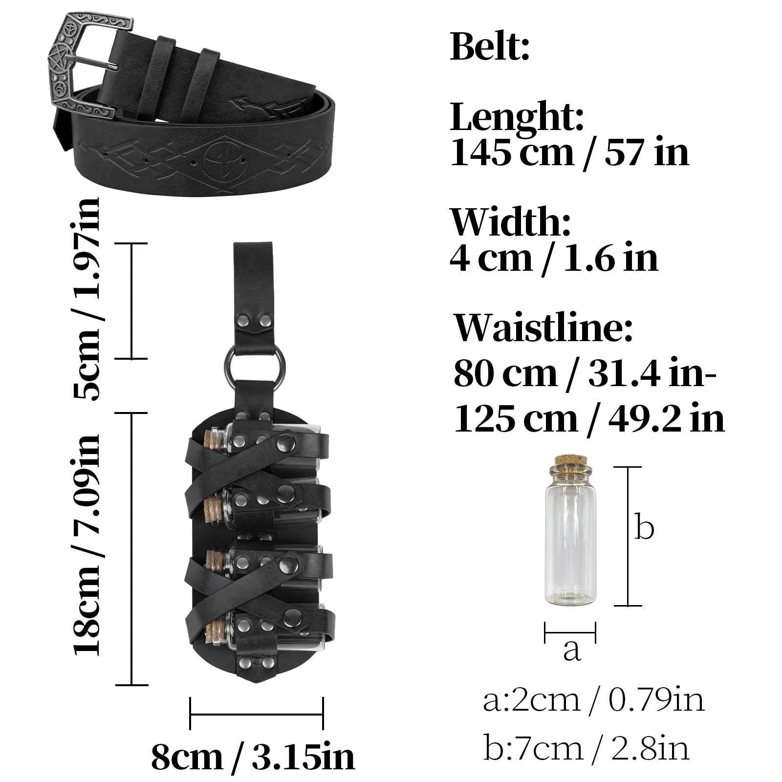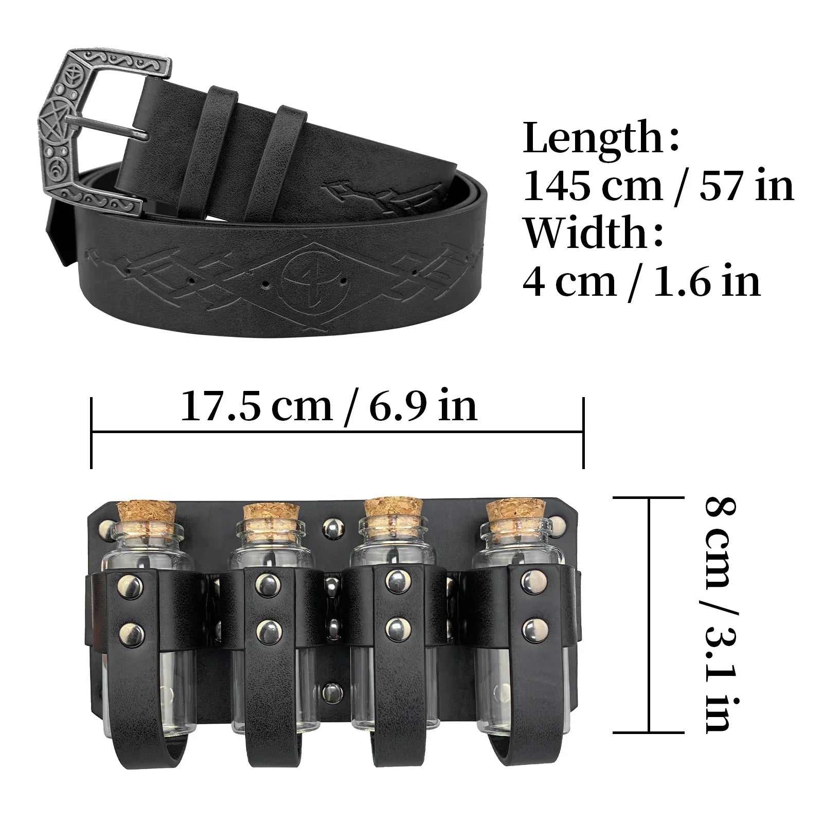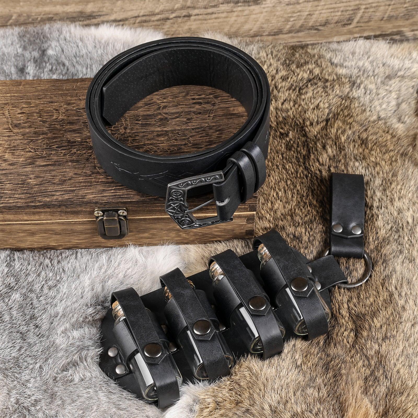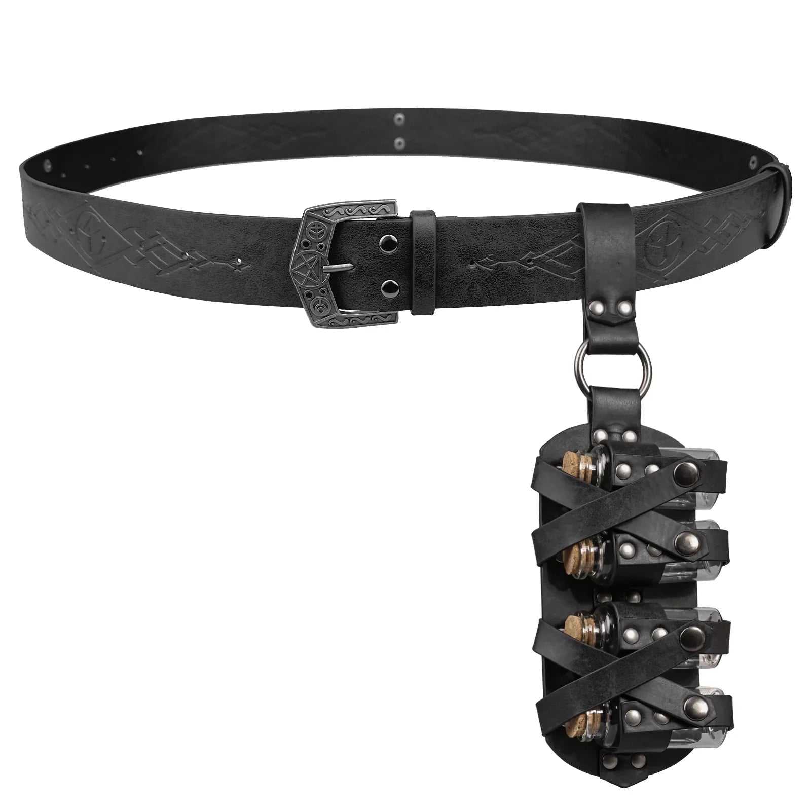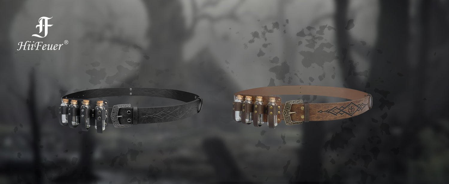 - COOL DESIGN- Featuring fantasy embossing for a distinctive and magical look, this belt comes equipped with four glass potion bottles, ideal for storing small amounts of liquids or small accessories. Each bottle is securely fastened yet easily accessible. The belt is sure to stand out on any adventure.