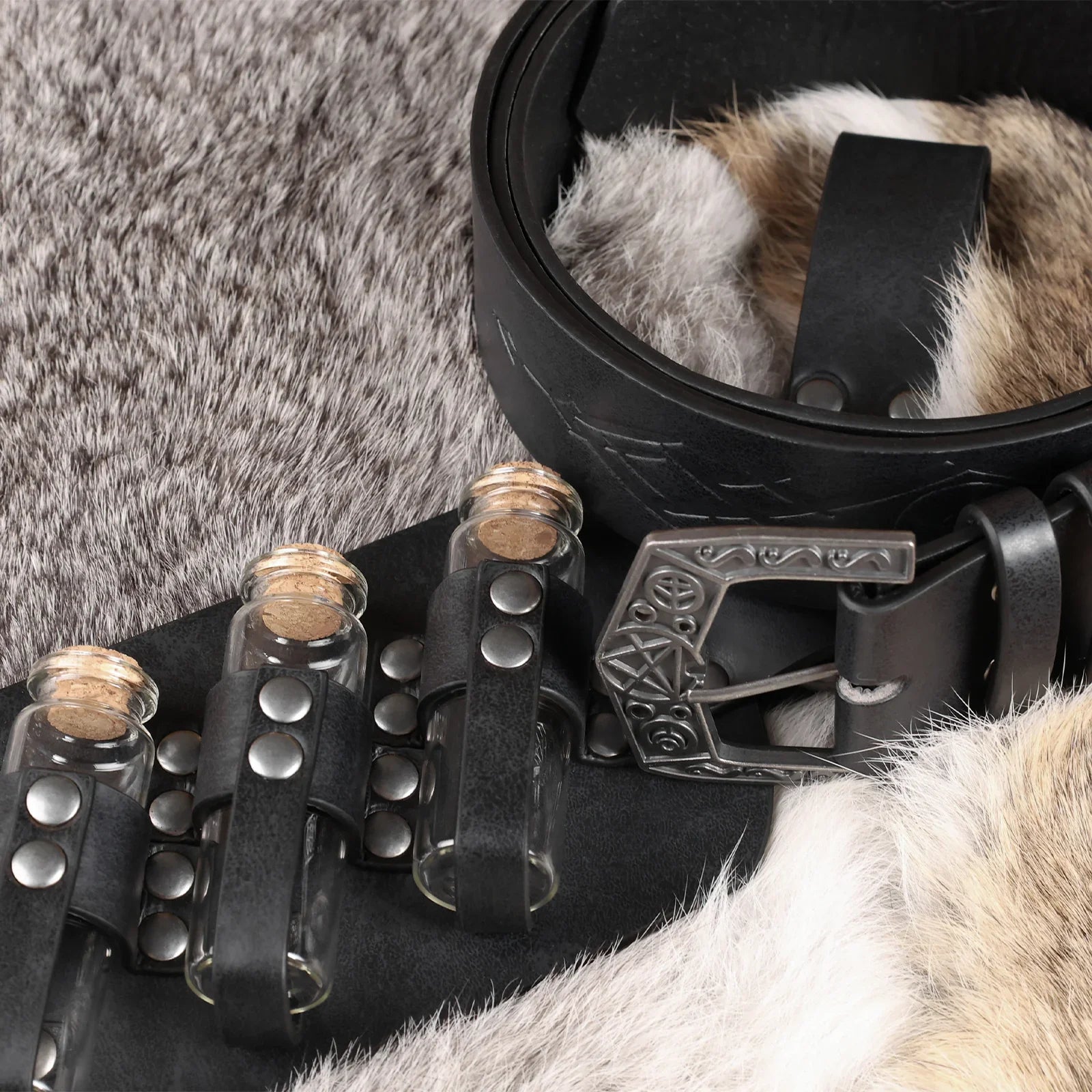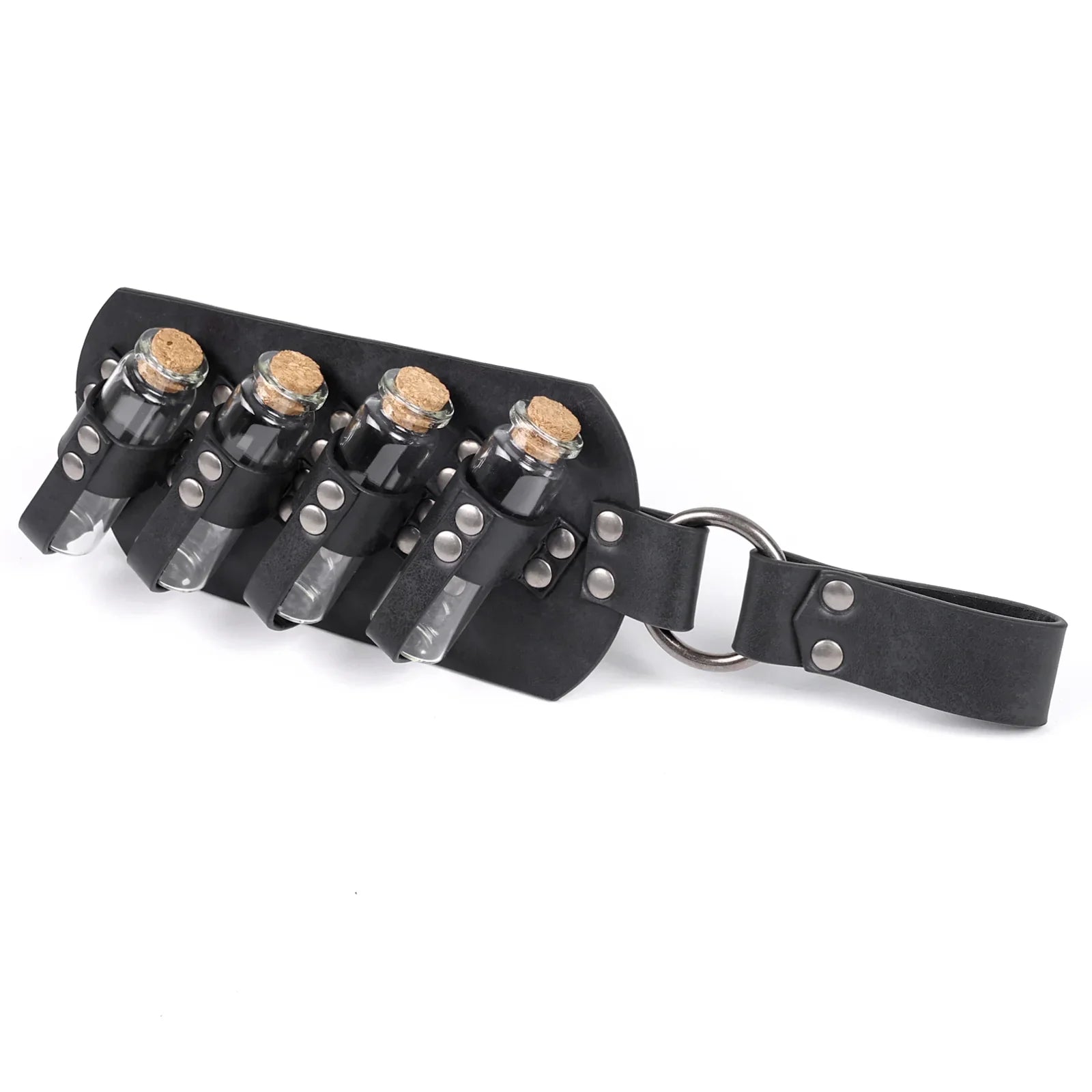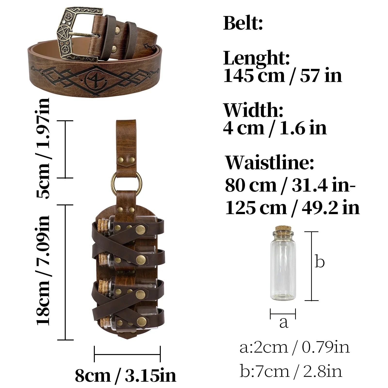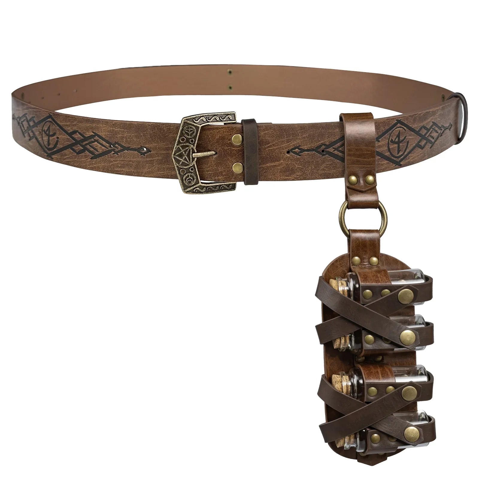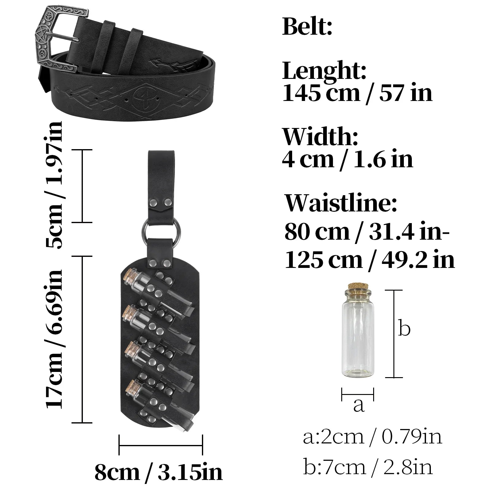 - COOL DESIGN- Featuring fantasy embossing for a distinctive and magical look, this belt comes equipped with four glass potion bottles, ideal for storing small amounts of liquids or small accessories. Each bottle is securely fastened yet easily accessible. The belt is sure to stand out on any adventure.