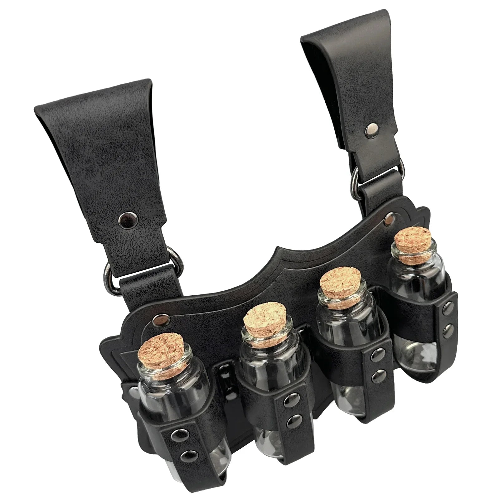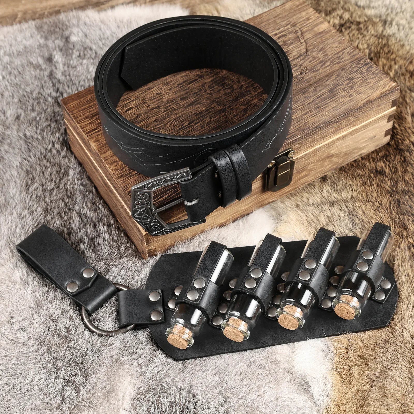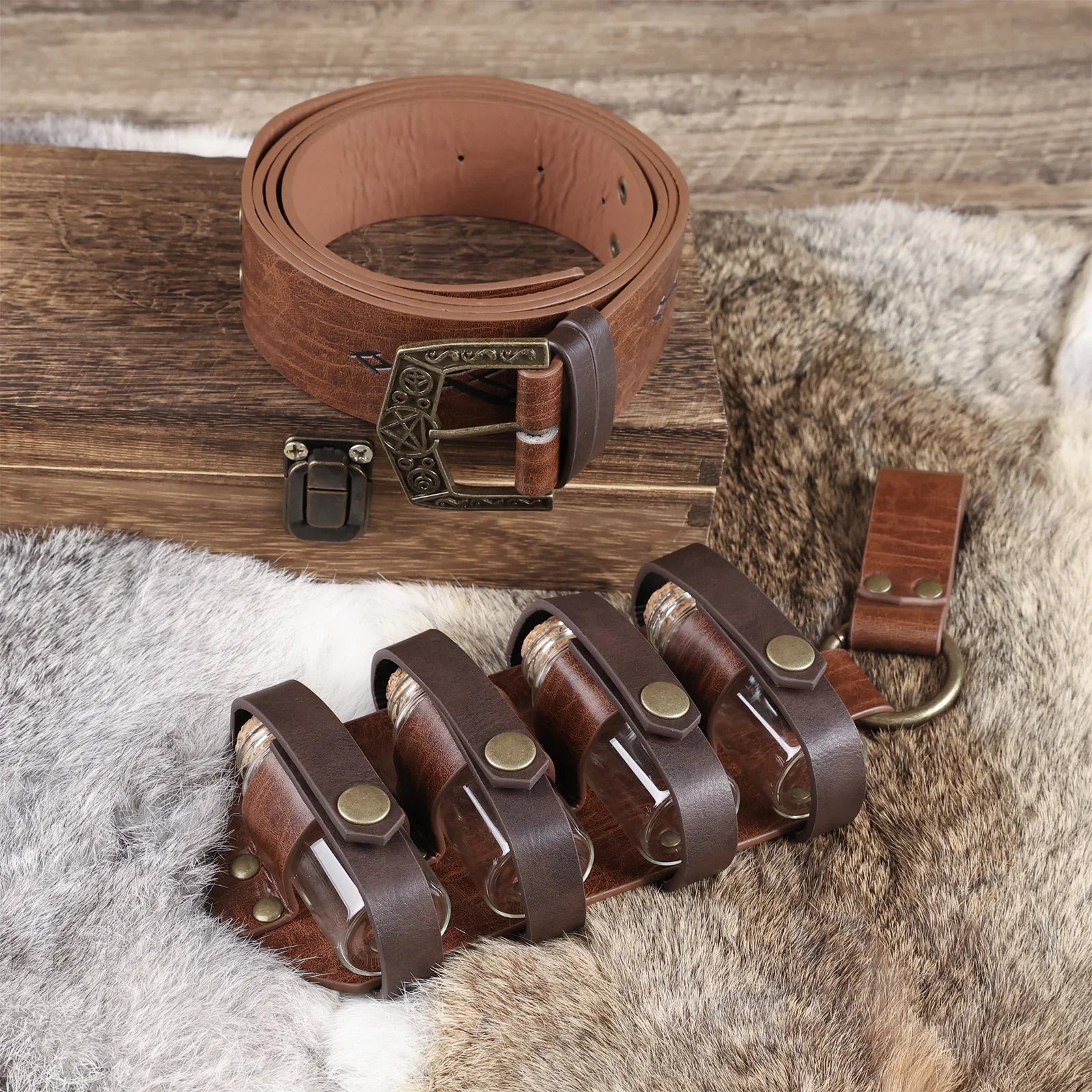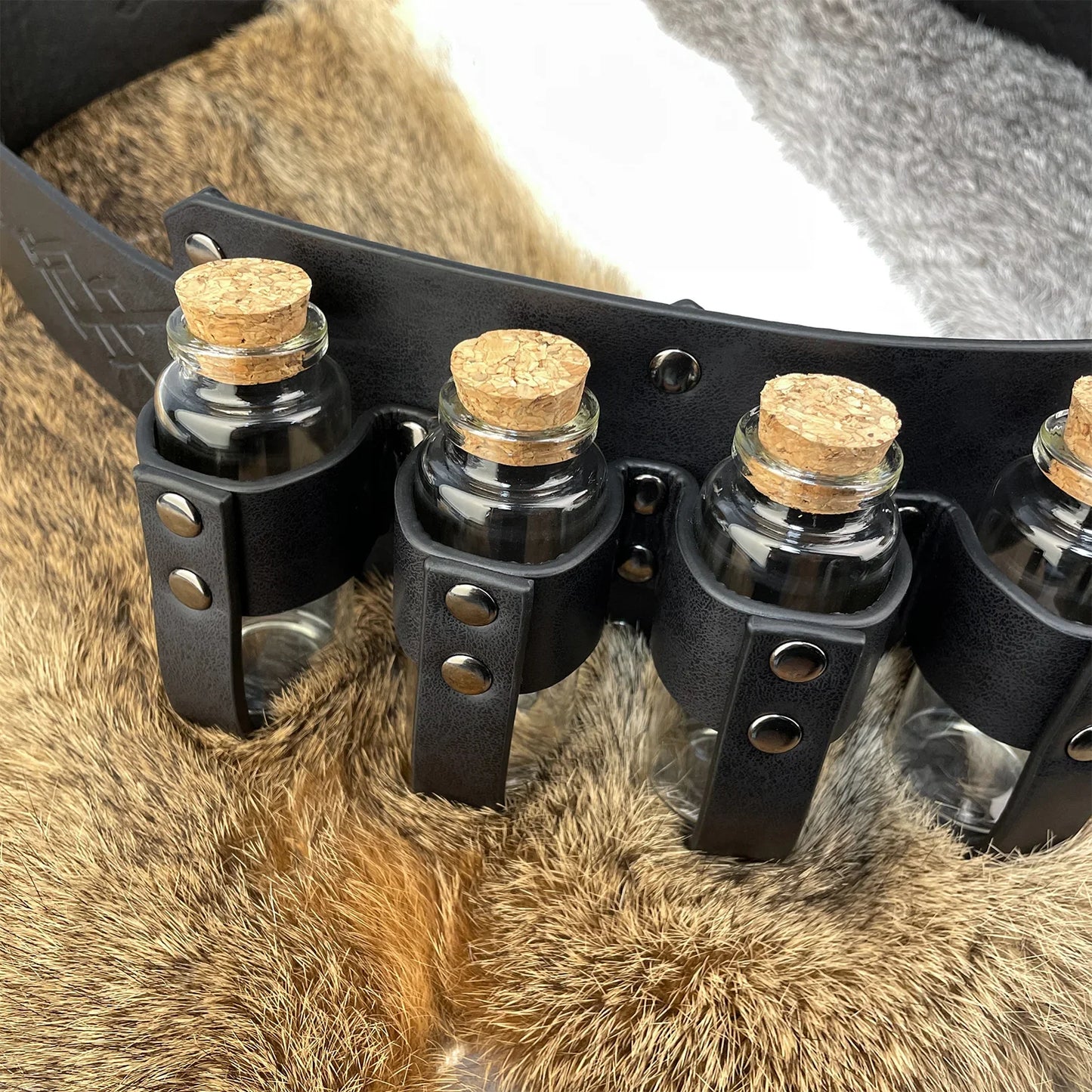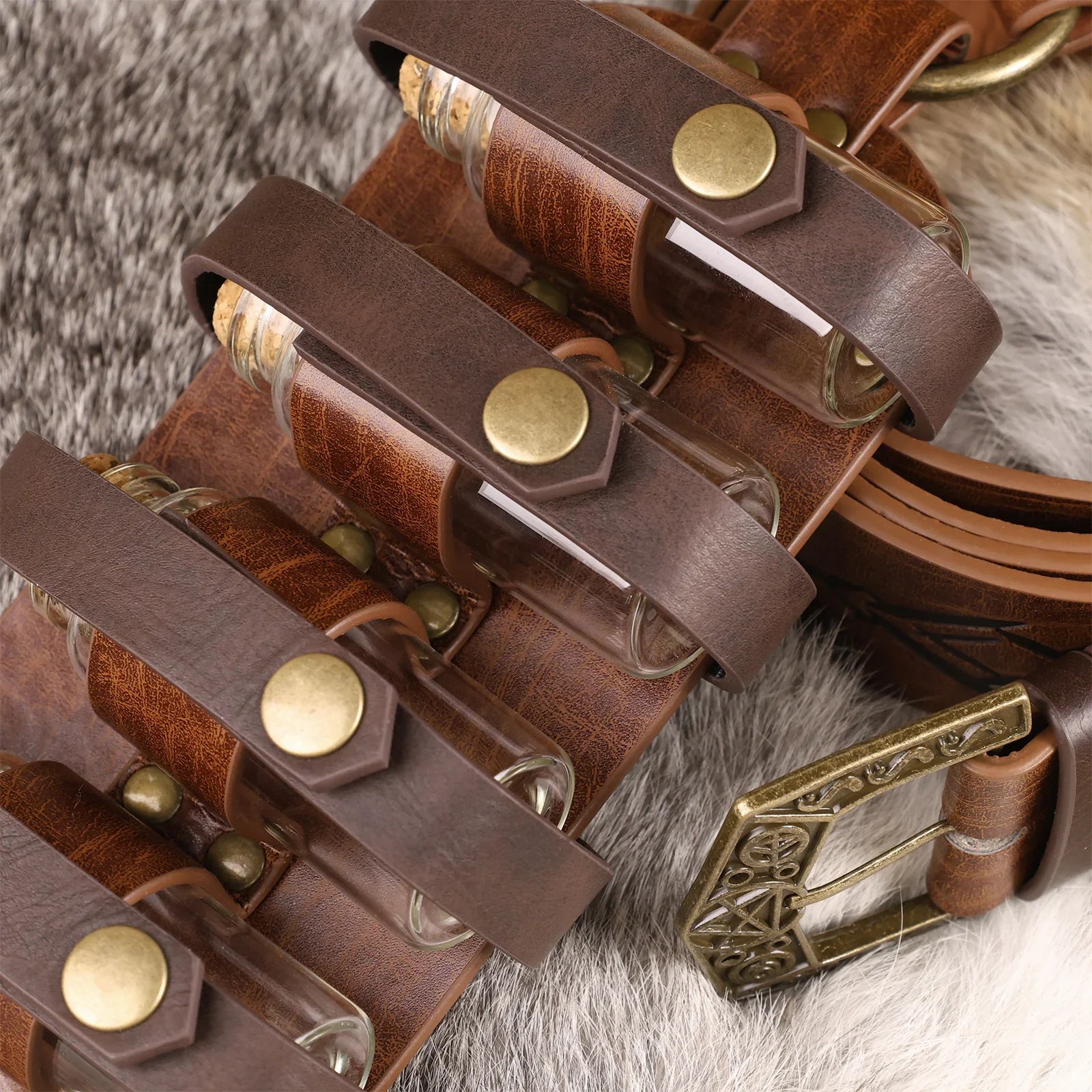 - COOL DESIGN- Featuring fantasy embossing for a distinctive and magical look, this belt comes equipped with four glass potion bottles, ideal for storing small amounts of liquids or small accessories. Each bottle is securely fastened yet easily accessible. The belt is sure to stand out on any adventure.