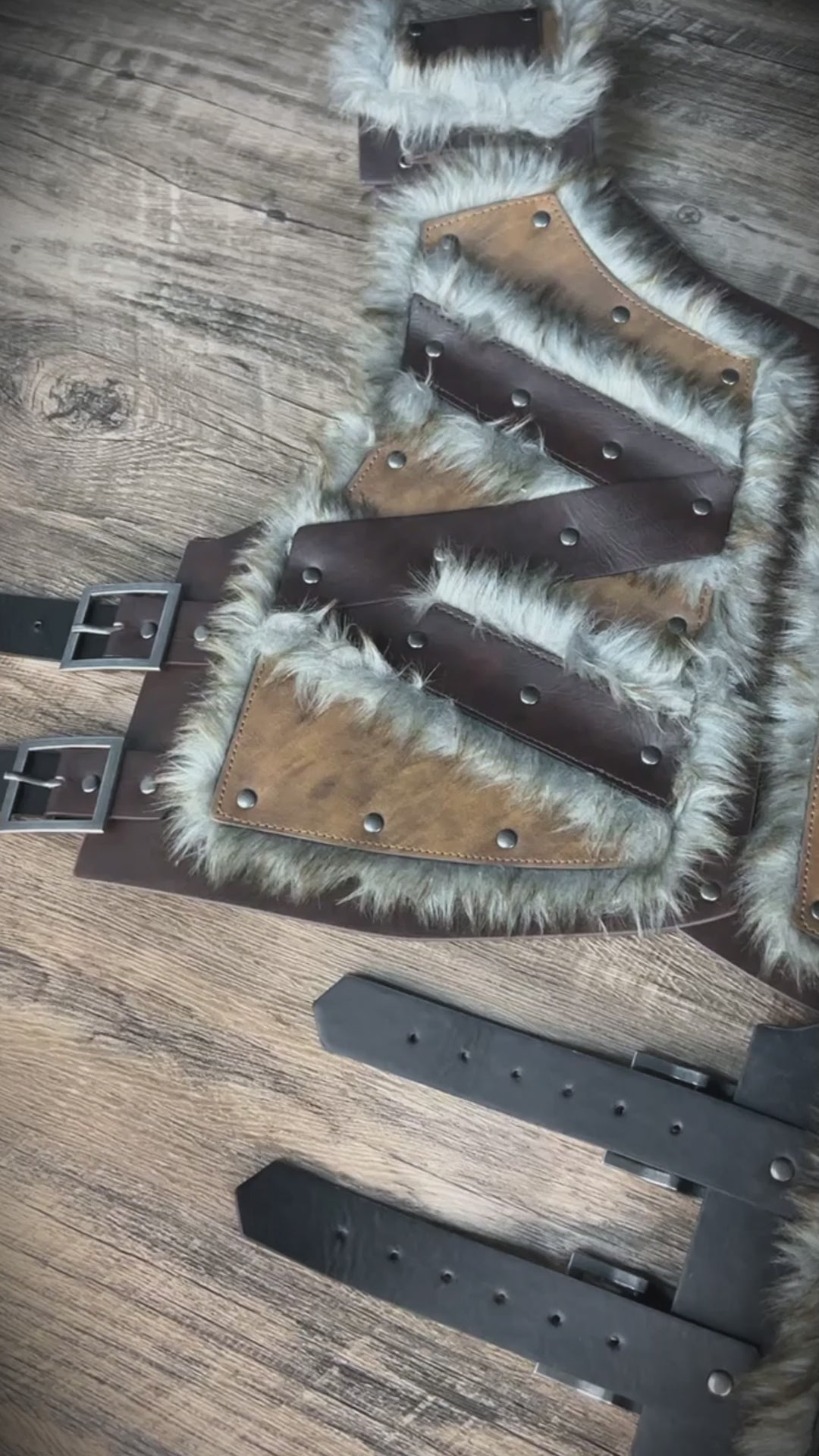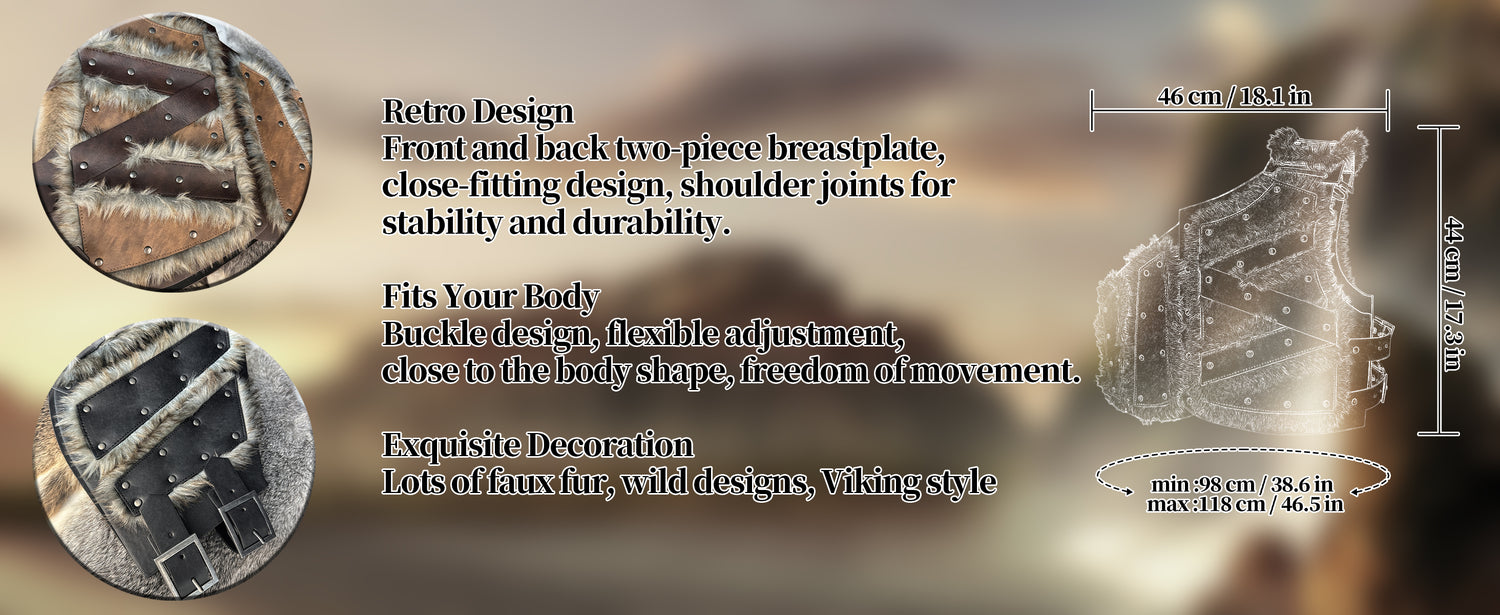 - COOL DESIGN- Special vintage design, stunning look with buckle closure, front and back two piece design connected by shoulder pieces to increase overall solidity and faux fur around the edges add a touch of wild beauty to this breastplate.